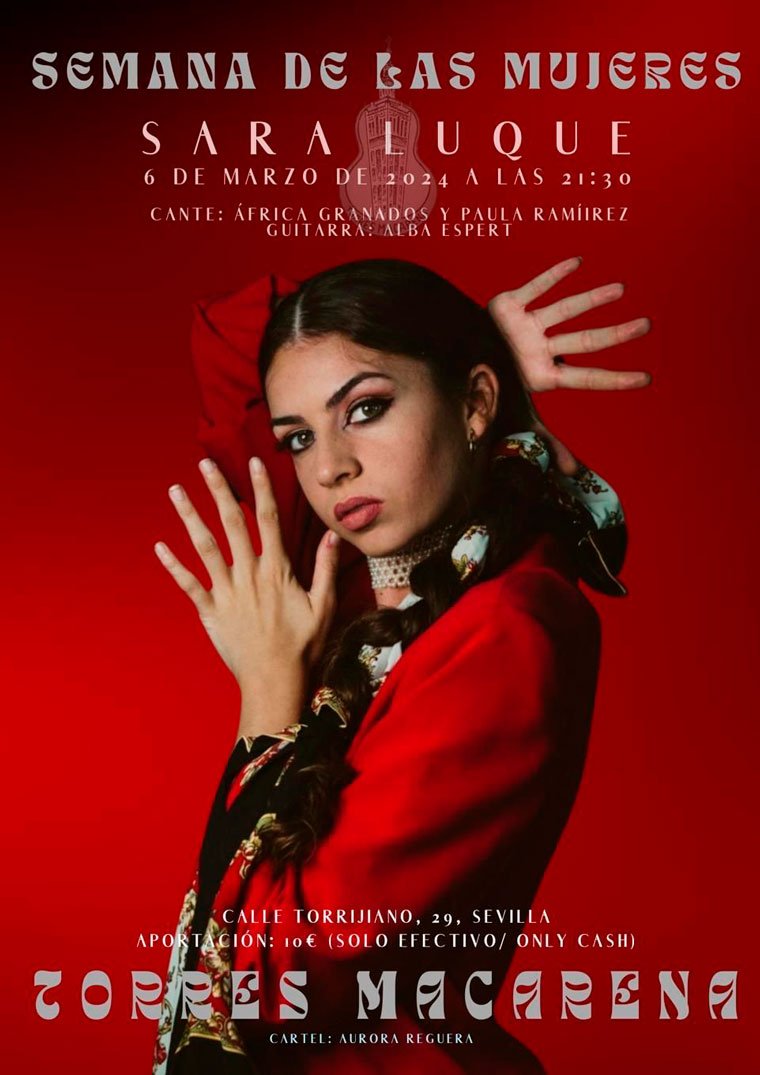 Semana de las mujeres Sara Luque / Flamenco/Copla Evento concluido Mié 6 Mar 2024 21:30h Peña Flamenca Torres Macarena de Sevilla Sevilla Ver mapa de localización del lugar
