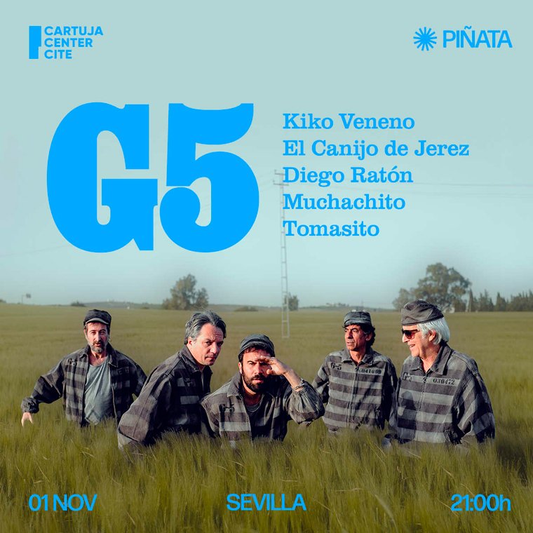 Han pasado 19 años desde aquella explosión llamada Tucaratupapi. Corría el año 2006 cuando Kiko Veneno, El Canijo de Jerez, Muchachito, Tomasito y Diego Ratón se encerraron en un estudio de Jerez y sacaron un disco que fue más una fiesta que un álbum, más una declaración de libertad que una grabación convencional. Se hacían llamar G-5 y lo suyo era mezclar rumba, rock, flamenco y jaleo con una naturalidad que solo dan los años de carretera, los tablaos, las plazas y los bares. Pues bien, G-5 ha vuelto. Y ha vuelto con todo. Ha vuelto con nuevo disco: El que quiera dormir, que se compre una colchoneta. Y este regreso también es a los escenarios. Después de completar su plan de fuga con paradas en Barcelona, Madrid, Valencia, Cartagena, Gijón y Calvià, y agotando entradas en varias ocasiones, siguen en la carretera. El 1 de noviembre estarán en el Cartuja Center Cite de Sevilla, dentro de la programación de Piñata Music Series. Ve inflando la colchoneta y consigue ya tu entrada para disfrutar del G-5 en directo.