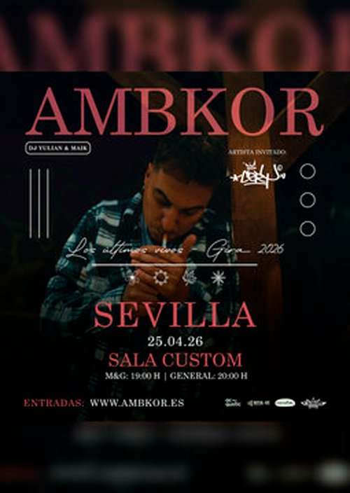 “LOS ÚLTIMOS VIVOS”, es el último álbum de Ambkor para este 2026, compuesto por 20 canciones divididas en 4 EP’s, que representan las 4 estaciones y con colaboraciones tan diversas como Shé, Santu, Ramudo, El Chojín, ZPU, Locus,.... Este disco es, sin ninguna duda, el punto más intenso de su carrera y ahora, toca presentarlo en directo, junto con todos los clásicos de su carrera, con un show lleno de magia, intensidad, emociones, lágrimas y risas. No te pierdas un concierto que no va ha dejar a nadie indiferente.