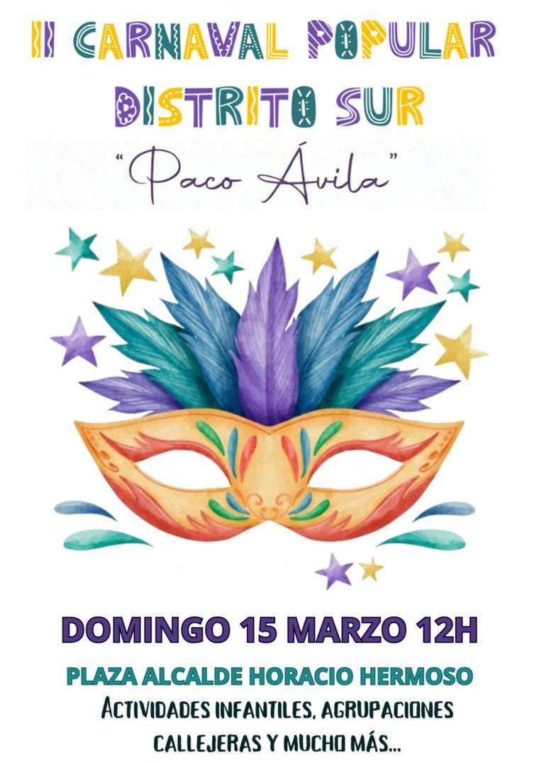 El próximo domingo 15 de Marzo se celebrará el Segundo Carnaval Popular del Distrito Sur "Paco Avila" de Sevilla Capital, el evento tendrá lugar en el barrio del Tiro de Linea, en su plaza Horacio Hermoso y en el mercado de abasto adjunto,donde habrá pasacalles, murgas, chirigotas, concurso de disfraces, concurso de dibujo para el cartel del Carnaval del año siguiente , pintacaras, taller de elaboración de caretas para el disfrute de pequeños y mayores, etc... Todo amenizado por el ambigú de la peña Bética y el ambigú de la Peña Sevillista del Barrio del Tiro de Línea, con degustación gratuita de arroz iberico con los productos donados por los puestos del mercado.