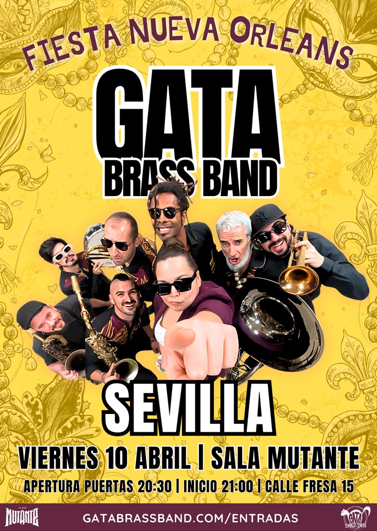 GATA BRASS BAND es una descarga de funk y ritmos de Nueva Orleans con sabor andaluz que convierte cada concierto en una fiesta inolvidable. Con instrumentos de viento y percusión, los sonidos del beatbox y una potente voz soul crean un sonido único, lleno de fuerza y creatividad. Con sus espectáculos interactivos y dinámicos, el público no es sólo espectador: baila, canta y forma parte del show.