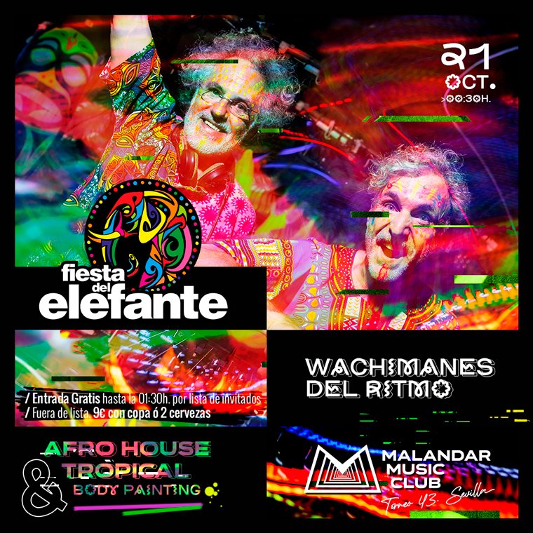 Las Fiestas del Elefante son una explosión de ritmos, luz y color. Ritmos afrocubanos, brasileños y africanos se mezclan con la electrónica en la pista de baile. Diversión asegurada de la mano de Los Wachimanes del Ritmo.