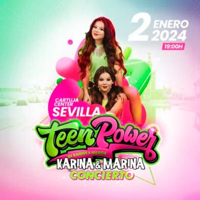 Karina y Marina llega a Sevilla con su gira de conciertos en un show especial para el nuevo año , "Teen Power" donde se podrá disfrutar de los mejores éxitos de Karina y Marina fusionados en forma de canto, baile, acrobacias, gimnasia rítmica, y un increíble espectáculo visual. Es una de las youtubers más populares en España, sumando millones de seguidores, con 11 libros en el mercado, más de 30 canciones originales, todas con videoclips y varias serie emitidas