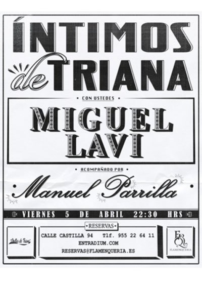 Íntimos de Triana se prolonga desde el 12 de Enero hasta el 24 de Mayo, a razón de dos recitales mensuales. Como viene siendo habitual, los recitales están encuadrados los viernes a las 22:30h y cuentan con un aforo de sólo 90 personas.