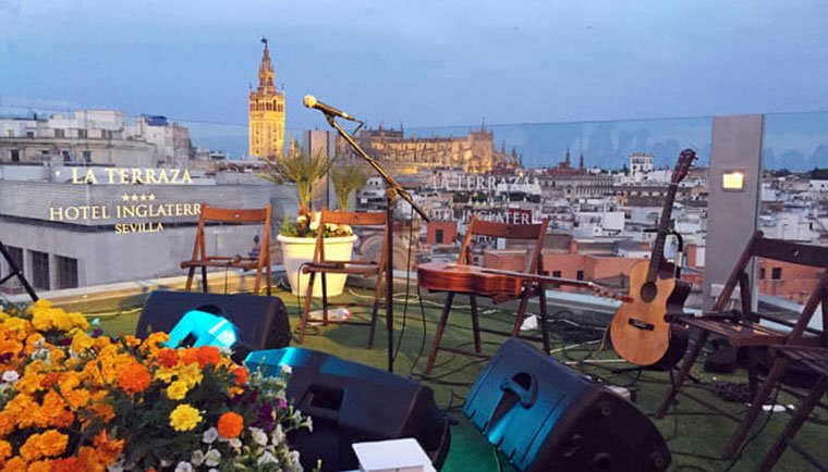 Situada en la planta más alta del hotel, las maravillosas y espectaculares vistas de La Terraza del Hotel Inglaterra le sorprenderán por ser un espacio único y perfecto en pleno centro histórico de la ciudad. La Terraza, cuenta con una superficie de 200 m2 y su capacidad es de hasta 100 personas.