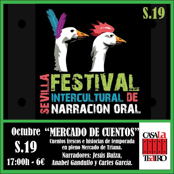 Este año el FINOS (FESTIVAL INTERCULTURAL DE NARRACIÓN ORAL en Sevilla) el festival de los cuentos de Sevilla ocupará Casala Teatro con dos funciones familiares. Bajo el nombre de MERCADO DE CUENTOS, cada día se presentarán tres cuentacuentos que harán un repertorio fresco y de temporada.