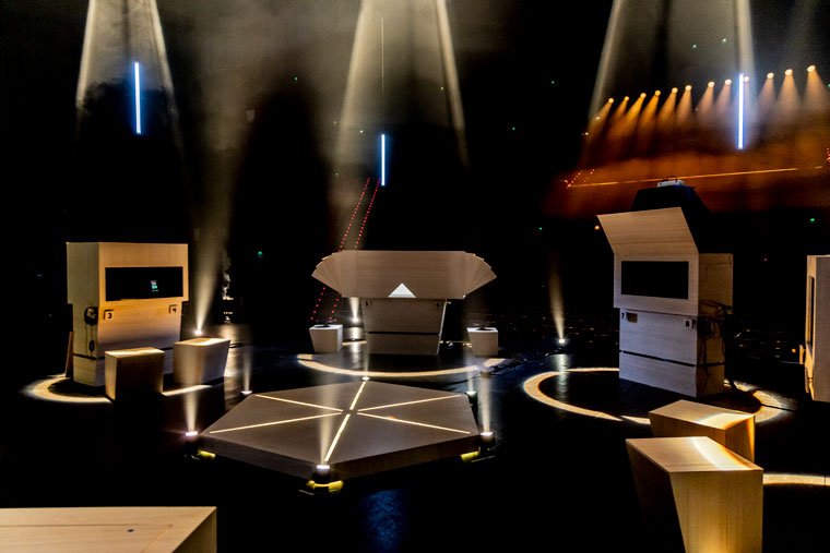 Acompañados de un guía pasamos de un dispositivo a otro de forma ordenada y coordinada. Se trata de una voz en off, que podría parecer la voz de un asistente virtual o IA entrenada para ser emocionalmente “inteligente” y que, paradójicamente, resulta más acogedora que la de una persona de carne y hueso, quien quizás podría incomodarnos, mientras esta voz en off nos hace ser más obedientes.