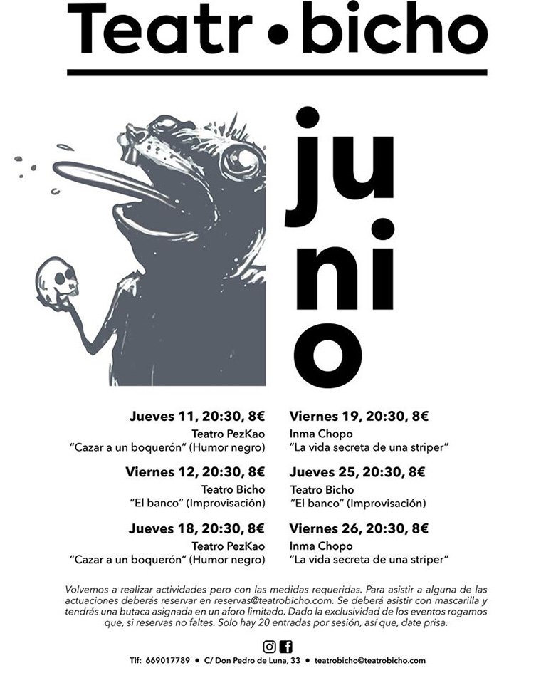 Volvemos al ataque, pero con cuidadín y con las medidas requeridas. Debido a la excepcionalidad, tenemos un aforo muy limitado, así que si te animas a venir tendrás que reservar en reservas@teatrobicho.com. Si no hay reserva, no se puede asistir al espectáculo.Tendrás que llevar tu mascarilla y se te asignará una butaca que mantiene las distancias con las otras.