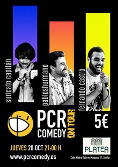 Si no nos conoces, somos dos frikis del stand up comedy y montamos un show de monólogos rápidos en un local molón y poco mainstream del centro de Sevilla. PCR Comedy es el stand up comedy más puro y cutre que podrás encontrar en toda Andalucía, y para disfrutar de él solo te cobramos la miseria de 5 euros con el fin de que el show no nos salga a devolver. ¿Qué más queréis? Cada mes que montamos el evento lo petamos, y ahora volvemos con otros 4 cómicos deseosos de probar material y, de paso, los refrigerios ocurrentes del Lady Drama Café Teatro: Pabloshurmano, Suricato Capitán, Carlos Doncel y Carmen Boza. Ni que decir tiene que este evento cumple y garantizará todos los protocolos de seguridad anti COVID y que, si alguno sale detenido, será por alguna broma políticamente incorrecta.