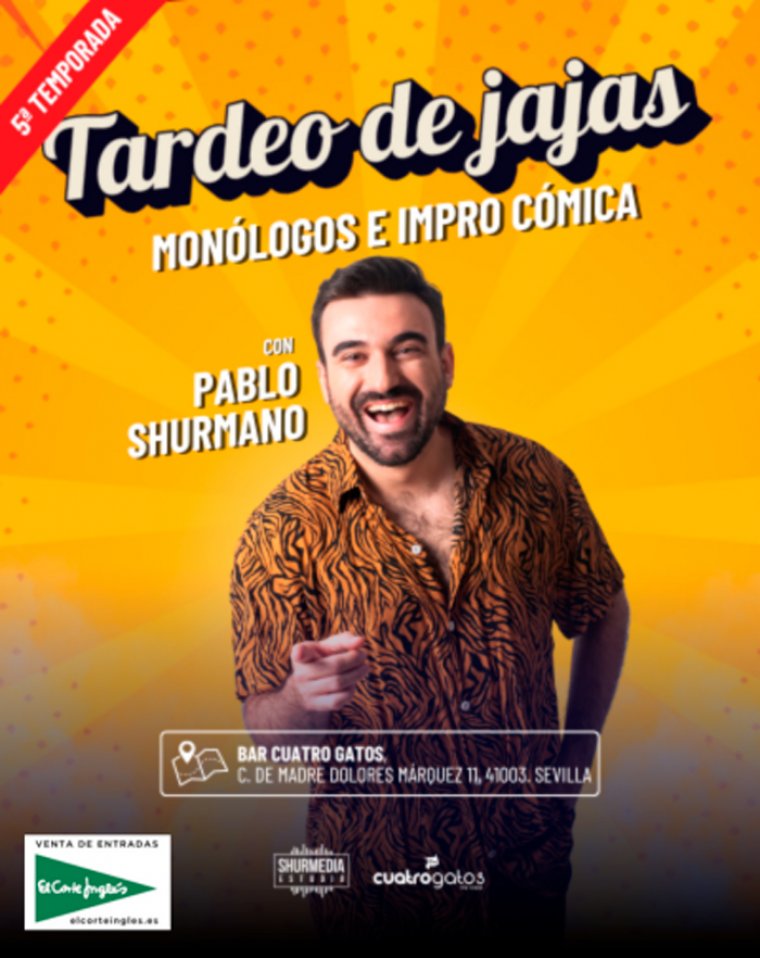 "Tardeo de jajas" es el nuevo show del cómico, actor e influencer Pabloshurmano. Tras más de 5 años actuando en salas y teatros de Sevilla, y tras una gira nacional durante la temporada 2023-24, Pablo estrena ahora un nuevo y desternillante formato totalmente imprevisible, en el que cada show es completamente diferente al anterior y donde nunca sabrás que pasará: stand up, impro, juegos con el público, chistes, canciones en directo, performances, proyecciones... ¡Lo único seguro es que te irás con agujetas en los abdominales de tanto reír!